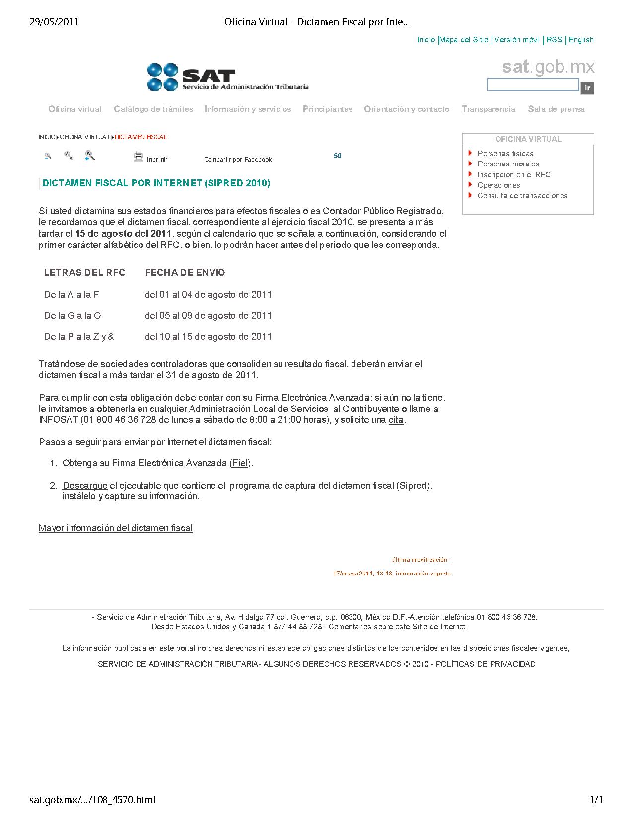 El SAT publicó en su pagina como fecha limite para la presentación de dictámenes el dia 15 de Agosto de 2011, de los dictamenes de los ejercicios 2010, para aquellos que esten obligados, que opten por dictaminar y que no sean sociedades controladoras que consoliden fiscalmente su resultado pueden optar, dependiendo de su primera letra del R.F.C. presentarlo anticipadamente.
